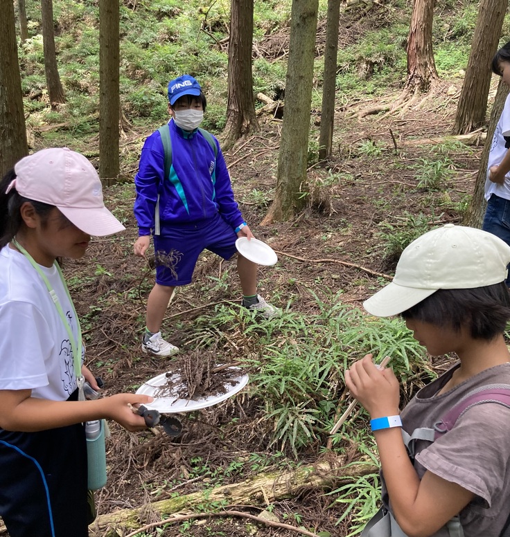 初めて触る子も多い中ヒルの触り方・獲り方をヒル研メンバーが教えてあげると、みんな夢中で獲りはじます。さすが秦野っ子怖がる子は一人もいません。ひとしきり沢沿いで獲った後、杉の森に移動します。「どこに隠れているかみんなで探そう。」皿とトングが配られ杉の落ち葉をひっくり返したりしながらみんなで探しました。森の中で「見つけた!」「いた!」という歓声が飛び交い好奇心全開でみんな探し回っています。