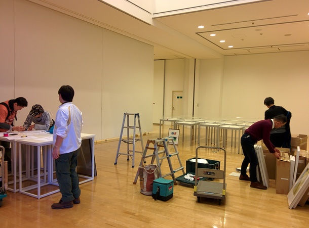 「午后の風」設立から3カ月、「はじめての坂口尚展」から1か月、「12色物語」復刊プロジェクト目標額達成から1日(まだ2日残ってますが)、「マンガ作品保存会MOM」がNPOとなるまでおよそあと1カ月(予定)。写真は展覧会の設営風景です