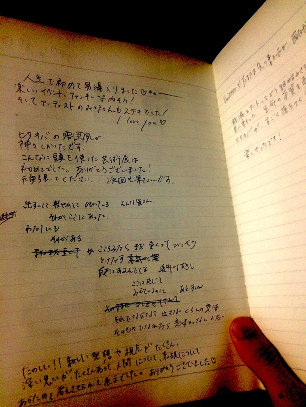設営中にアーティストが壁から落っこちたり、展示をみて涙が止まらなくなってしまう方がいたり、初めて出会った人同士で何時間も話し込んでしまったり、色んなことがありました。お風呂と間違えてタオル片手に入ってきた方が、そのまま入館してしまい、どうなることかと思っていたら「すごく楽しかった!」と言っていただけた嬉しいハプニングもありました。