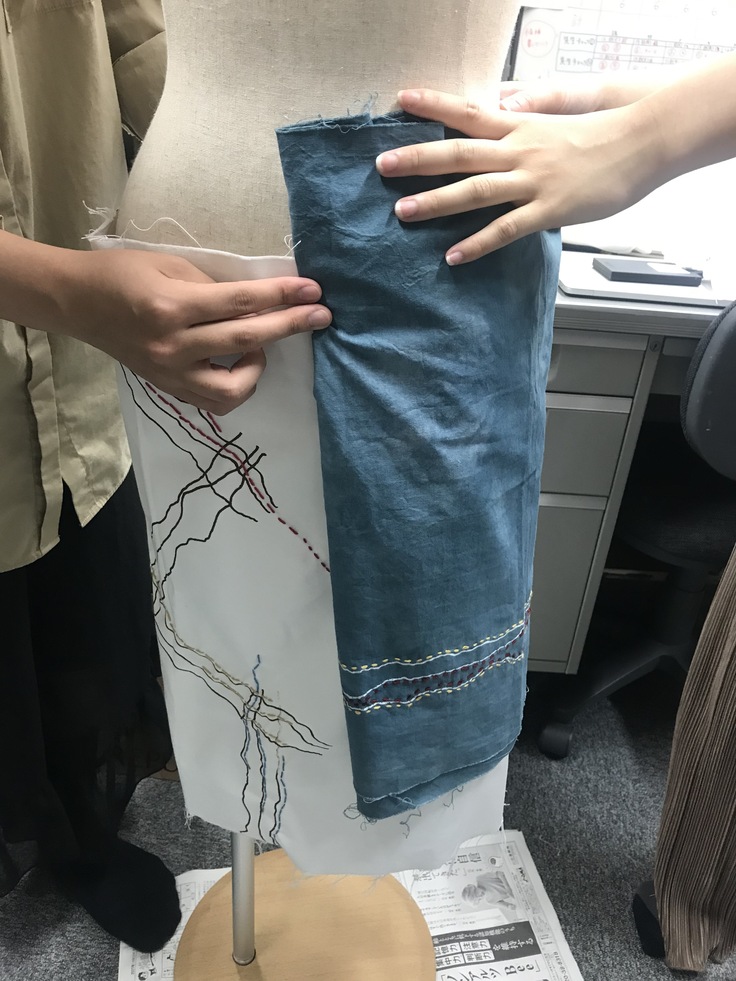 刺し子した布を郵送してもらい、パーツを回収。学生で集まり、パーツを並べたりトルソーに巻いてみたりしながらどんなスカートにするか考えていきます。