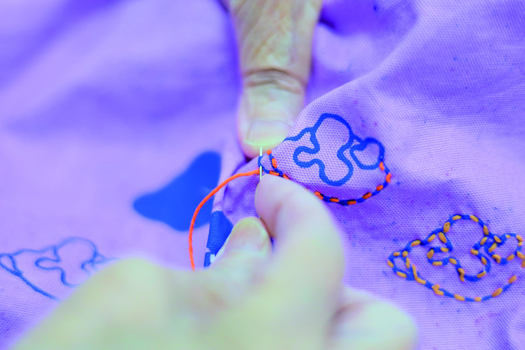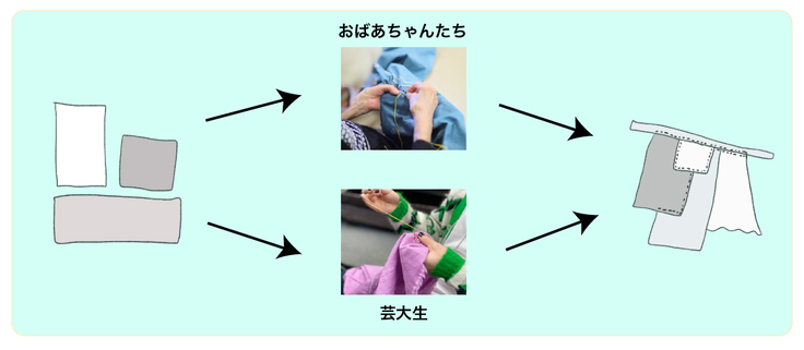 ひとめひとめの皆さんと活動する中で、「芸大生と一緒に大きな作品を作ってみたい」というお話を受けました。私も「おばあちゃんと芸大生みんなで刺し子をしたらきっと面白い作品ができるに違いない」と思い、学生を募ってワークショップを開催し、誰でも身につけられる「まとう刺し子」を共同制作しました。