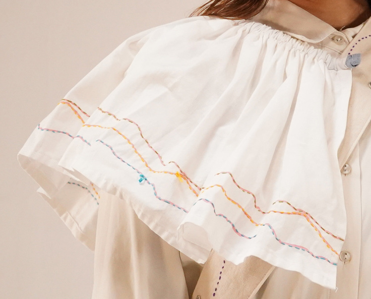 まとう刺し子とは、ひとめひとめのおばあちゃんと芸大生が刺し子した布を、自由に身にまとえるように加工したものです。