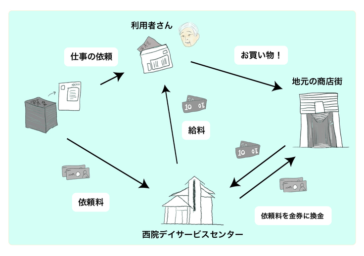 西院デイサービスセンターでは、近所の三条会商店街と提携し、地域を巻き込んだ仕事のシステムを展開しています。仕事の依頼料を商店街で使用できる金券に換金し、利用者さんに仕事の報酬としてその金券をお渡しし、利用者さんが商店街でお買い物をする、というシステムです。今回のプロジェクトでは、依頼料の全額が報酬として利用者さんに渡ります。