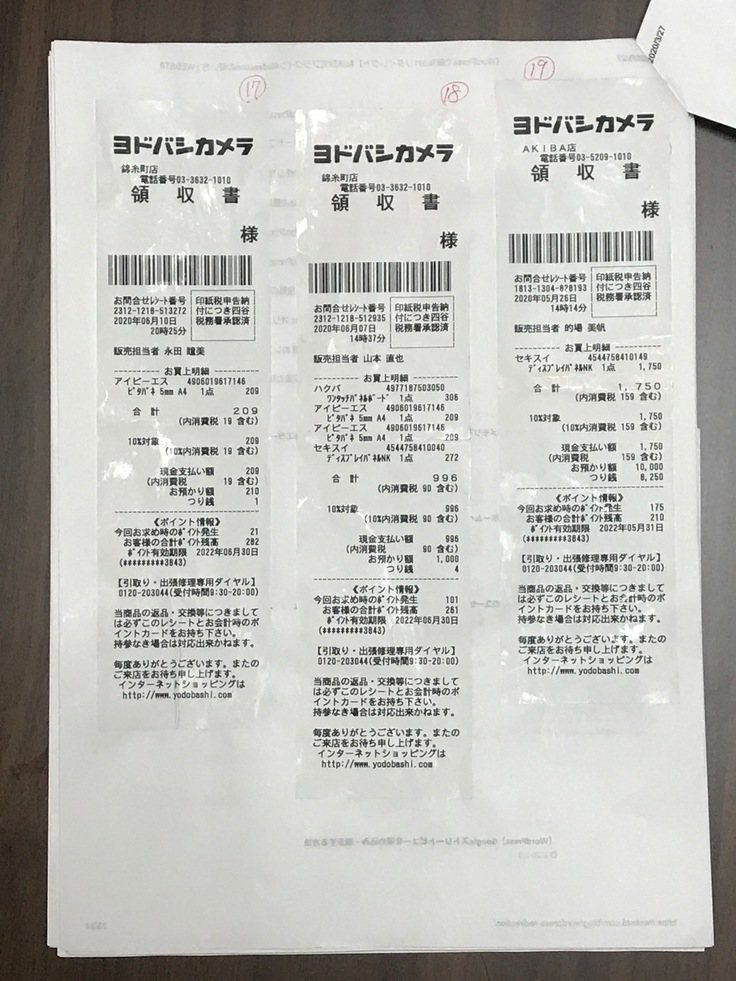 以下報告します。金額の右側の数字は領収書との照合番号です。