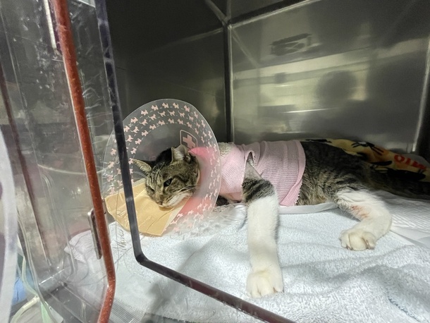 また切除したのは腫瘍プラスその周りにある筋肉、血管、一部骨で10センチ幅ほどなくなりました。手術後は安静が必要なのですがキジコよく動き回るそうです…そのため首に着けているカラーや包帯を自分で取り、体液を入れるチューブも噛みまくり昨日だけで3本交換してるそうです。その為、徹夜でキジコの様子を見てくださったみたいで午前4時くらいに寝たと聞きました。ご飯もちゅーる1本、マグロの缶詰を少し食べたそうで少し安心です。