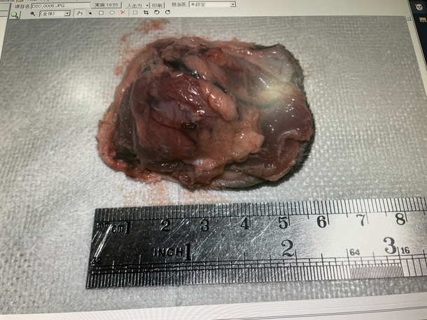 今回の手術で摘出した腫瘍になり6センチ幅もあります。さらに腫瘍以外の場所も摘出しているのでそれも合わせると10センチ程摘したと聞きました。こんなのが首のところにあったんだ…