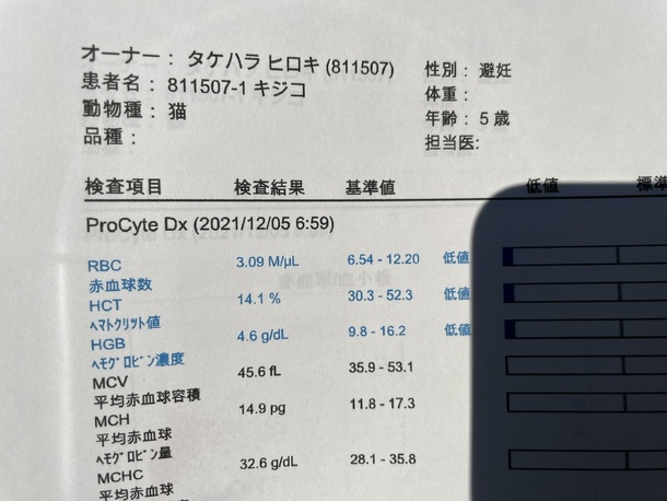 今日キジコの面会に行ったら診察室に呼ばれキジコのことについてお話があり、昨日面会後と朝に吐血を2回したそう。また歯茎の色や鼻の先端の色が薄くなってたみたいで急遽血液検査をしたところ重度の貧血になってたそうです。写真の真ん中辺りにある青色の文字でHTC ヘマトクリット値と言うのが30から52%の間なら正常なのですが昨日時点で14.4%、今朝は14.1%しかなく深刻な状態とのこと。原因は痛み止めの副作用?とストレスによる胃潰瘍で胃の中で出血してそれが出たのではないかと…薬を飲んで胃に膜を張り明日の昼くらいまで様子を見るのですがこの値が10%を切ると命に関わるそうです。そうなると輸血が必要で輸血することになった場合、僕の家にいる2番目の子を病院に連れてきてほしいそうです。