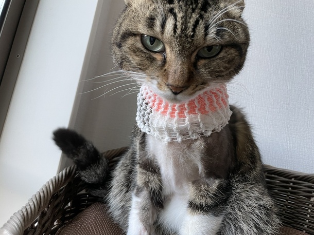 あと傷口から浸出液と言う液がタラタラ流れてくるのでガーゼと包帯を使って液を吸収していますが首辺りに付けてるので口で器用に取ってしまいます。付けとかないと床や体が汚れるし傷口保護にもなるから付けといてほしいです。