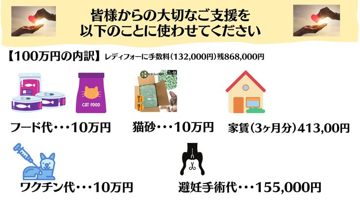 【今回募った費用で実施するプロジェクトの内容】 保護猫活動を継続させるプロジェクト 募った費用は保護猫活動に役立てられます 【資金使途と項目ごとの金額の内訳】 ・保護猫活動:フード費用10万円分 ・保護猫活動:猫砂費用 10万円分 ・保護猫活動:ワクチン代10万円分 ・保護猫活動:避妊手術代15万5千円分 ・家賃費(3ヶ月分)413,000円 ・クラウドファンディング手数料 132,000円