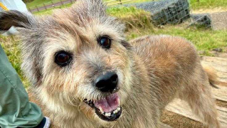 最初の場面の口元のアップと、ラストシーンで新しい飼い主さんと一緒に歩いていくシーンのわんこです。