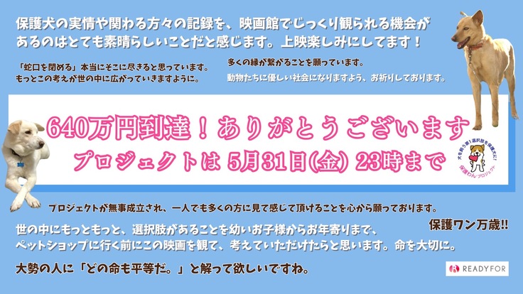 映画の予告編他、保護わんチャンネルたくさん拝見しました。 やっぱり多くの方に観てもらいたい!(私も観たい!笑) 追加で支援させていただきます。最後まで頑張ってください。