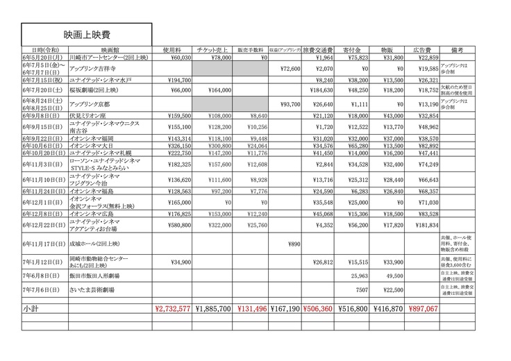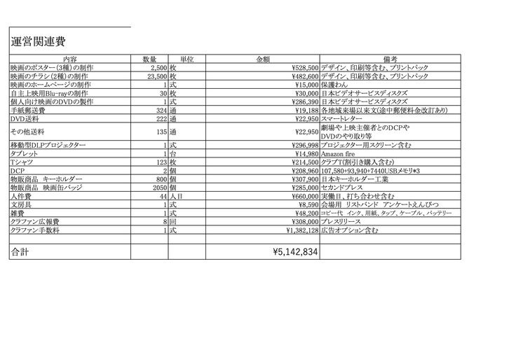 さて、大まかには、クラウドファンディングで達成した金額6,833,200円に対して、支出の映画上映費が1,280,940円、映画運営関連費が¥4,842,853となり、残金が¥709,407円となりました。