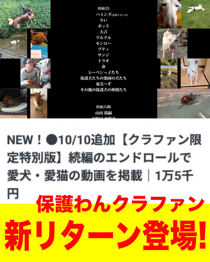 前作のエンドクレジットと同じような形で、続編映画のエンドクレジットに皆さまのご家族の愛犬猫の動画(スマホなどで撮影したもの)を掲載するリターンをご用意いたしました。