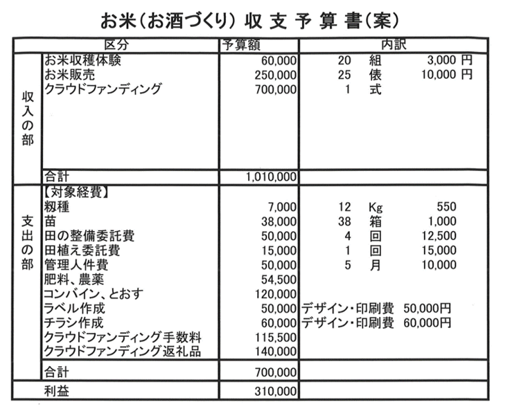 将来的に陶ブランドのお酒を委託製造したいと考えており、今回は、その計画の最初の段階である酒米の生産を実施します。籾種7,000円、苗38,000円、田の整備委託費50,000円、田植え委託費15,000円、管理人件費50,000円、肥料・農薬54,5000円、刈り取り・とおす委託費120,000円、ラベル作成費50,000円、チラシ作成費60,000円、クラウドファンディング手数料115,000円、クラウドファンディング返礼品140,000円