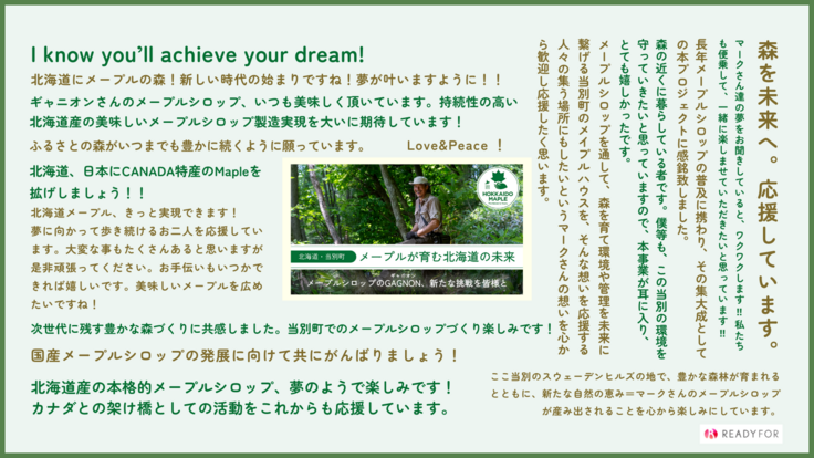 このたびは、北海道メープル製造に向けたクラウドファンディングに際し、皆さまより温かいご支援を賜り、誠にありがとうございました。