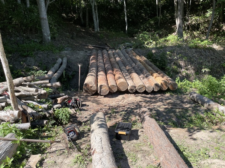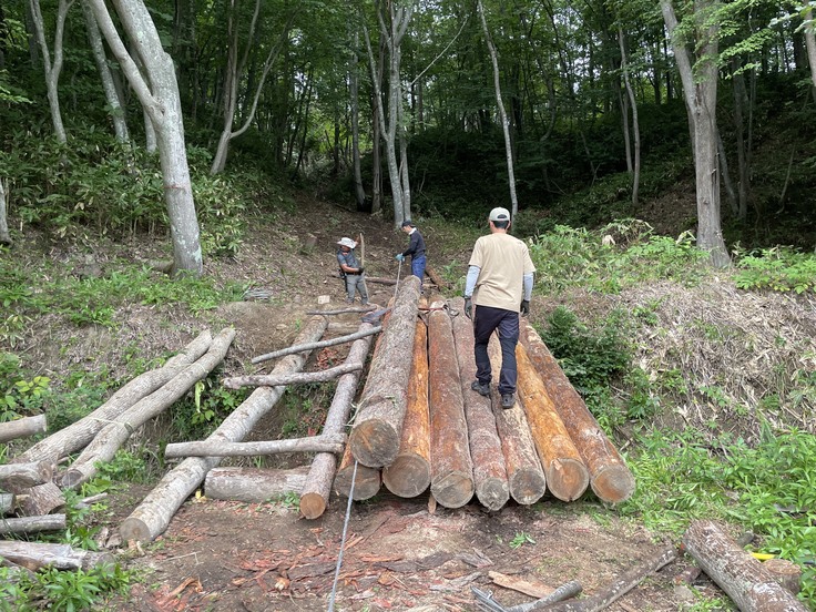 たくさんの方にお手伝いを頂き、森から木を運び、丸太を並べ