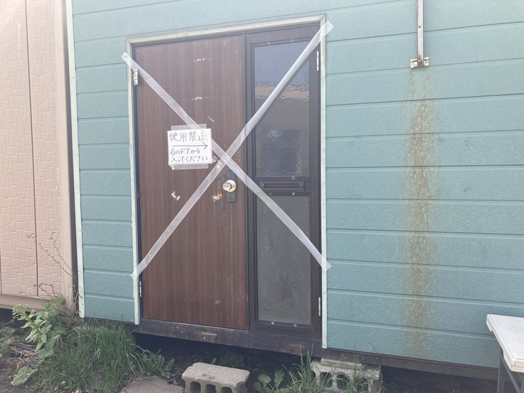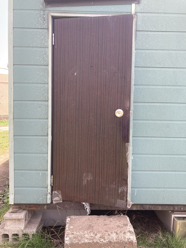 しかし、昨年の夏にドアが破損、その後修理をしてなんとか持ち堪えていましたが、今年に入ってから再び壊れ、写真からもお分かりいただけるように、とうとう使えなくなってしまいました。もう一方のドアも表面が割れて剥がれかけ、現在出入りにさえも苦労している状況です。