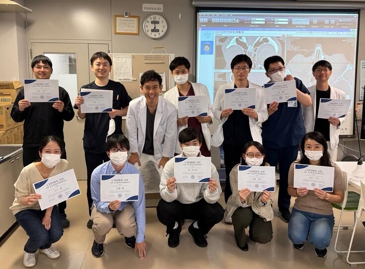 2021 年、2022年に副鼻腔CT読影力の向上を目指して、主に専攻医を対象に『副鼻腔CT読影ワークショップ』の開催を行ってきました。2024年はより多く先生方にとって学びのある内容へと修正し、『CT読影から内視鏡下鼻副鼻腔手術の治療戦略につなげる』ことをテーマとして開催しました。講演内容としては副鼻腔CT読影のコツを皆で共有し、読影で把握した副鼻腔解剖を手術に活かす方法(副鼻腔シェーマなど)について提案、さらに実際に内視鏡下鼻副鼻腔手術を行う際にどのように手術戦略へ反映しているかを確認してもらいました。今回のワークショップに参加された先生方には修了証を贈呈しました。