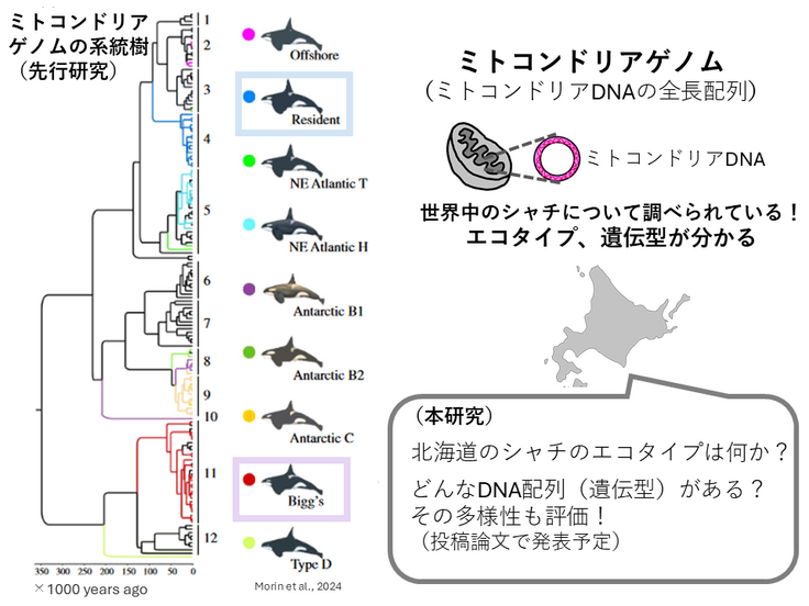 そこで、北海道でサンプルが得られたシャチについて、世界中のシャチで研究されているミトコンドリアゲノム全長を解読し、解析しました。