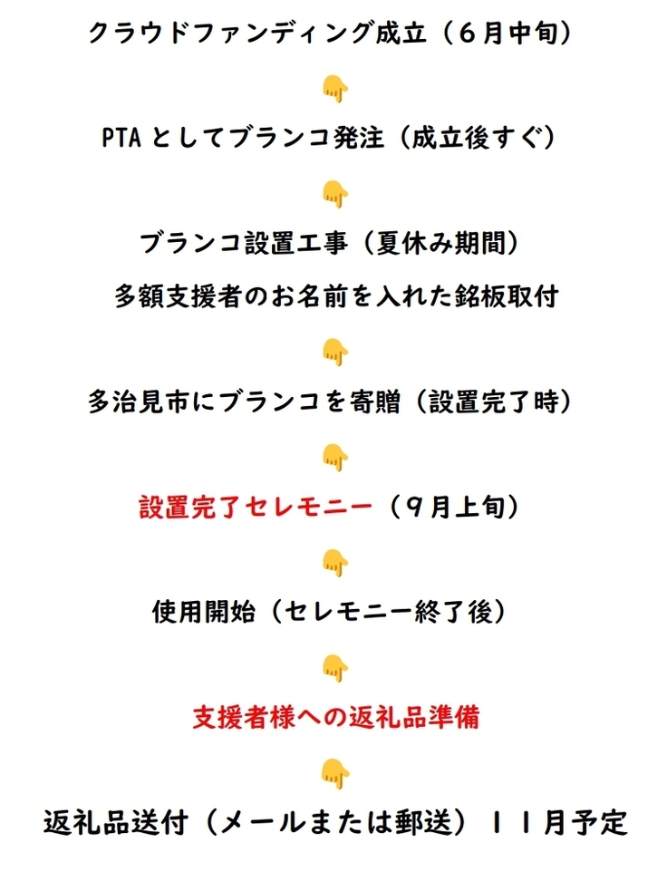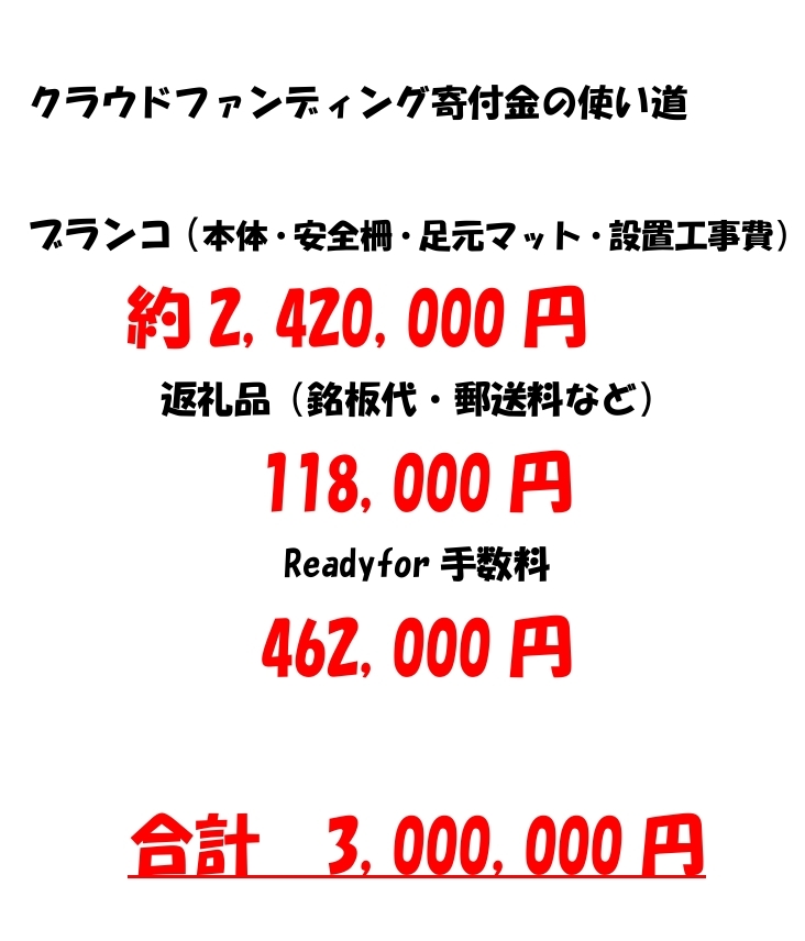 北栄小学校PTAが学校校庭に ブランコを設置します。 その後、多治見市に寄贈します。 (市の承諾済み) ブランコ本体 約2,420,000円 その他諸費用(返礼品用など) 118,000円 クラウドファンディング 手数料462,000円