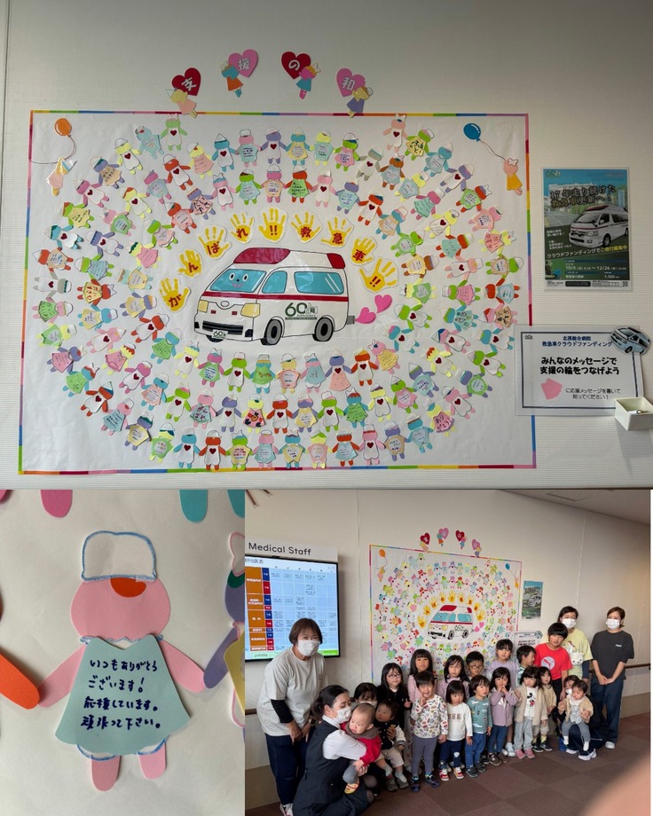 当法人の職員向け保育所「ほくせつ保育所」の先生方と子どもたちが、救急車クラウドファンディングのために「応援メッセージボード “支援の和(輪)”」を制作してくれました。