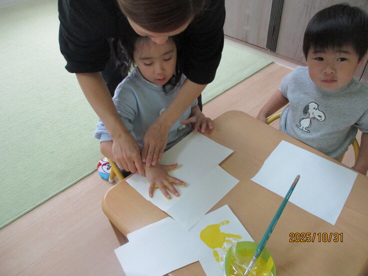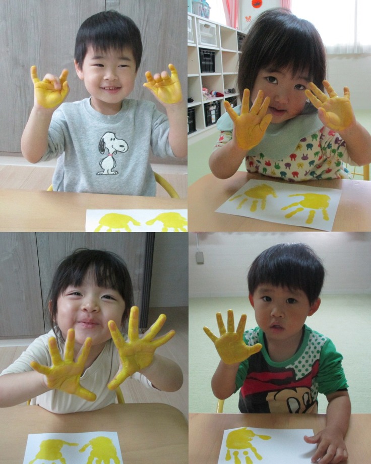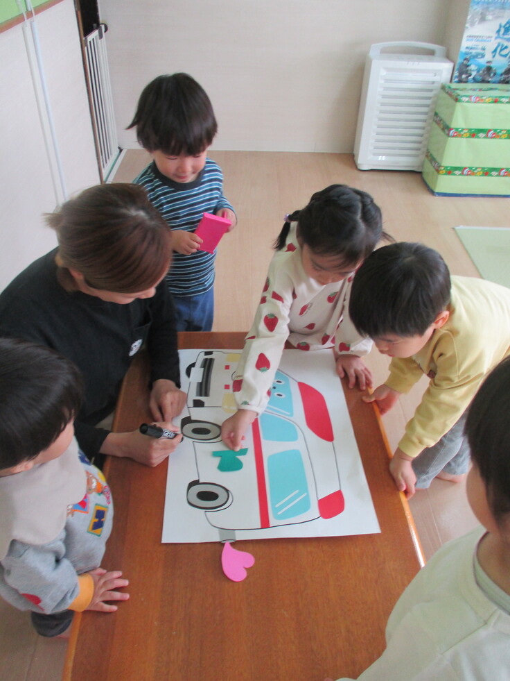 救急車のイラストは先生が描いてくれたのですが、その様子を見た年少さん・年中さんのこどもたちは「何やってるの〜?」「救急車だー!」と興味津々。 年長さんたちは、手に絵の具をつけて手形をとり、「がんばれ救急車!」のメッセージを作ってくれました。