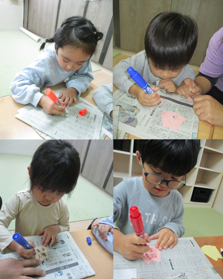 さらに、大きいこどもたちにはメッセージカードにそれぞれ応援の言葉を書いてもらい、「これはわたしが書いた!」「ぼくのはここに貼ってある!」と楽しみながら制作してくれました。