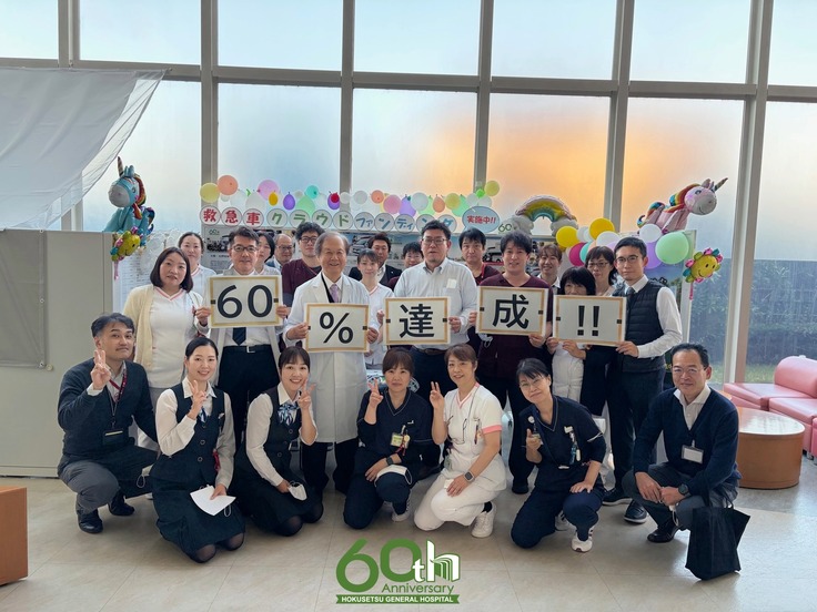 当院開設60周年の節目を記念して、達成状況を示すプレートを掲げ、スタッフ一同で集合写真を撮影しました。 写真には、皆さまへの感謝と、残りの道のりを全力で駆け抜ける決意が込められています。