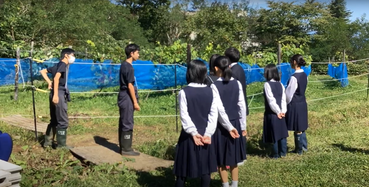 体験授業が終わった後はワインプロジェクトについて説明し、実際に本校の裏にあるブドウ畑を紹介しました。