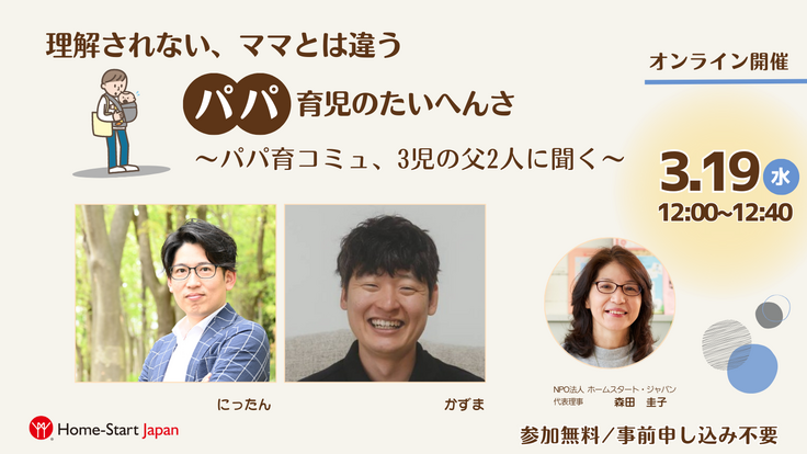 最近、ホームスタートでも、パパからの相談を受けることが増えてきています。ホームスタート・ジャパンの森田代表が、現場で聞く実情を交えながら、パパふたりの率直な思いを聞いていきます。