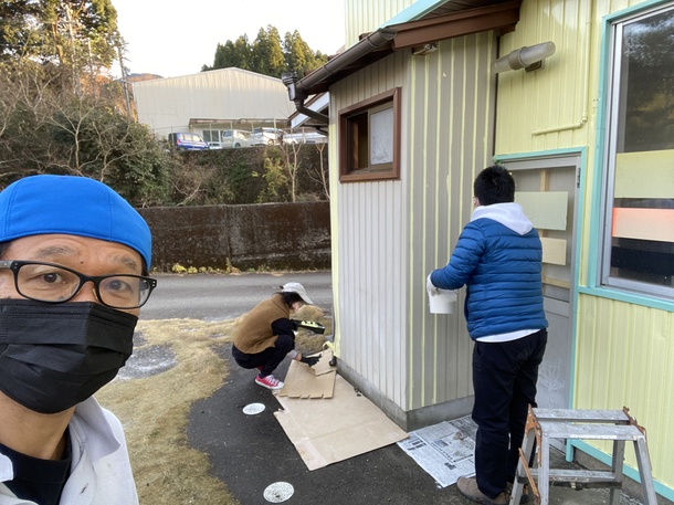 そんな内装の色のコーデネートが決まって、今度はスタッフでDIYをしました。ペンキを塗り残してある外壁を塗ることにしたんです。実は壁のトタンも、ドアの設置などで付けたり外したりしたので、色が剥げたりしたところがあるんです。それとペンキ屋さんに塗ってもらってないところも、何箇所か残っていたんです。