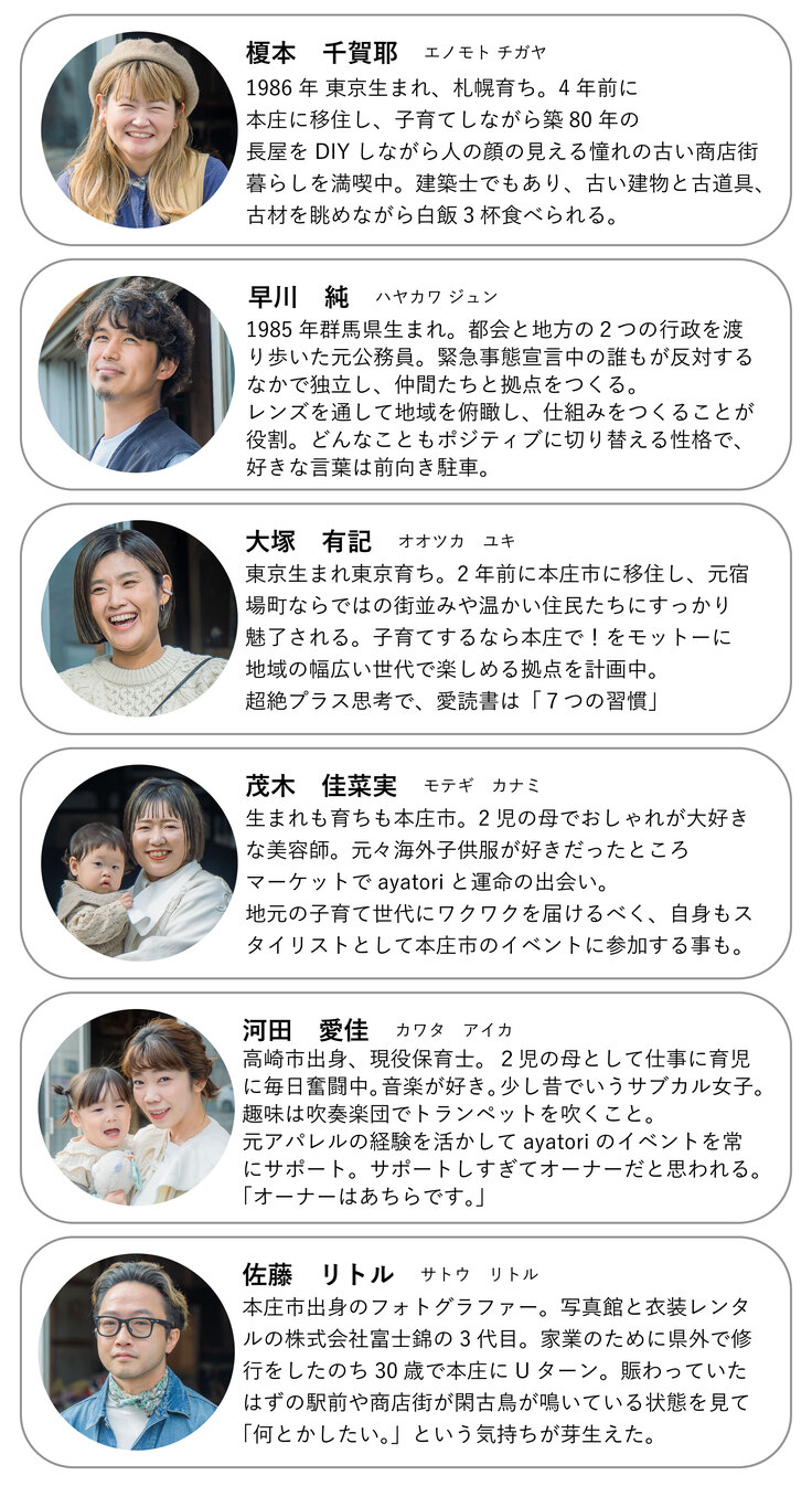 「本庄あたりの日常が、 ちょっとだけ楽しくなるヒントがある」「暮らしを、 ちょっとだけ豊かにする発見がある」「本庄あたりの、 ちょっとだけ 面白い人、素敵なもの 楽しい情報が集まるデパートメント」 をコンセプトに、本庄駅北口の銀座通りに拠点を準備中。 移住者と本庄ネイティブが入り混じる、クリエイティブユニット。