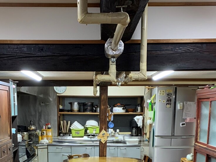 梁を残しながら、追加で基準を満たすため設置したスプリンクラーの管を見えないように埋め込んでもらいます。(圧迫感もあり、よく私も頭をぶつけています。)