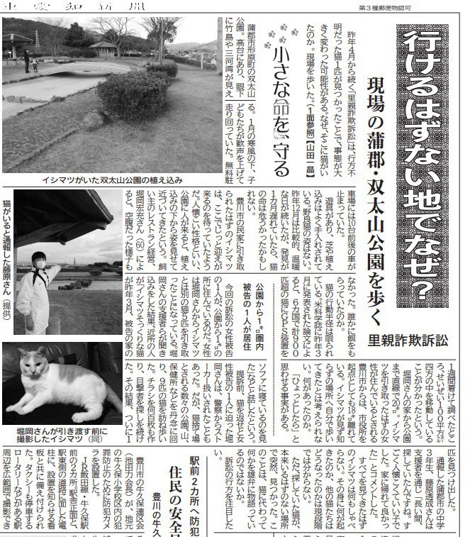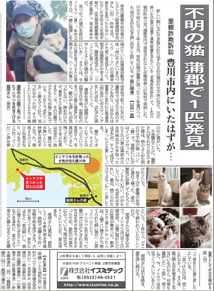 一昨年春から秋にかけて里親に譲渡された猫9匹が行方不明になり、現在名古屋地方裁判所豊橋支部で係争中の事件です。