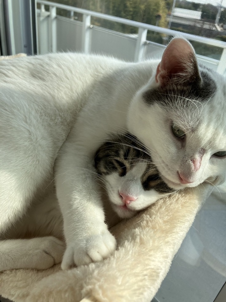 この3匹がどうなることかと心配をしていたのですが、なんと幸男くんは、子猫をぎゅうぎゅうに抱きしめて、抱きしめて、満足気。