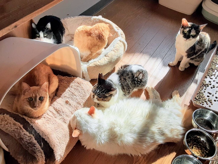 シェルターの子達、昼間お腹も満たされてまったりしています。