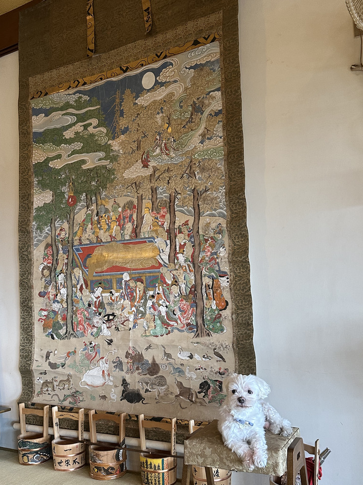 涅槃図から抜け出したとXで話題となっていました。寺犬のゴン太です。笑
