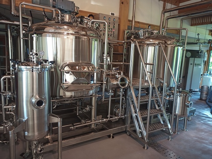 向かって左側のタンクで砕いた麦芽を煮て糖化させた後、濾しながら右側のタンクに移し、100度で煮沸した後ホップと酵母を投入し、急速冷却しながら発酵タンクに移します。