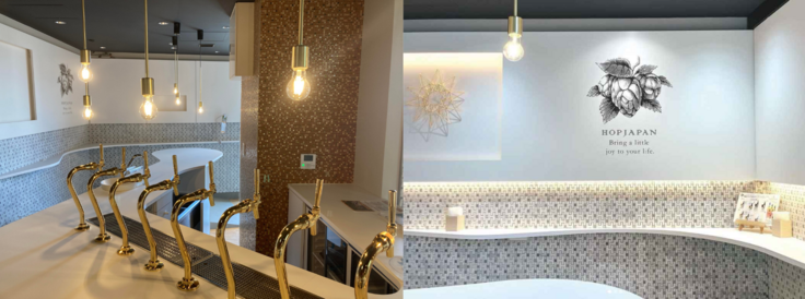 HOPJAPANの頭文字「H」タイルや邪魔な柱をビール泡モチーフのタイルであしらいシンボリックなデザイン要素にしてしまう発想力。