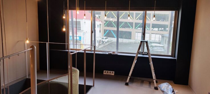 2階へ続く螺旋階段に照明も設置し、これからカウンターの椅子・テーブルを並べます。