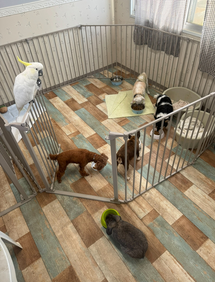 ワンコやうさぎ、キバタンなどみんな仲良く食事します