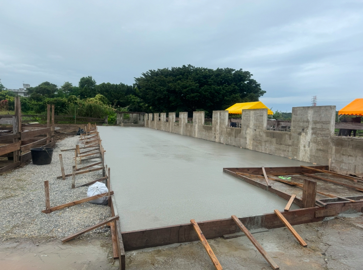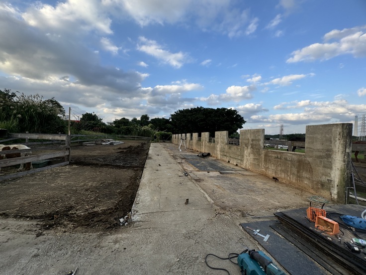 本日は雨の中の作業となりましたが、厩舎床面に厚さ10cmの土間打ちが完了しました。