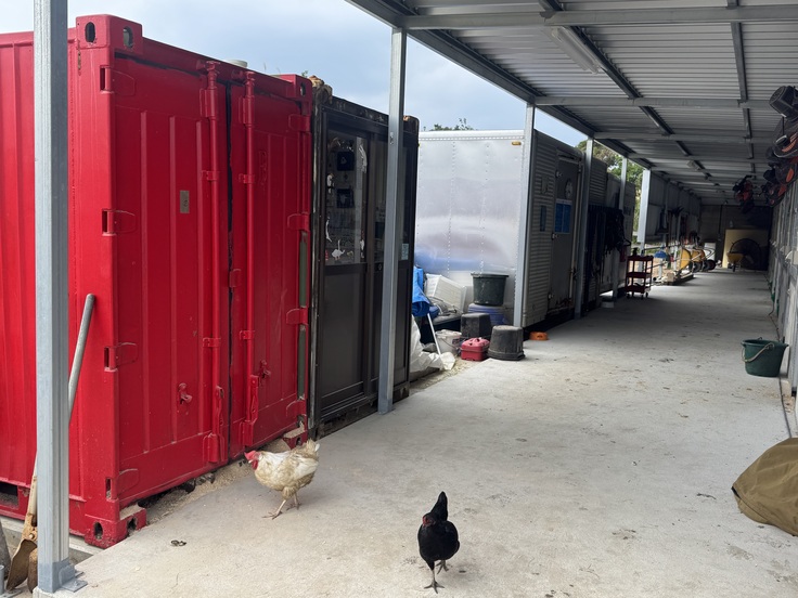 一見大した変更ではないように見えますが、少し離れた場所にあったオガクズ保管用のコンテナと、フード保管用のコンテナを厩舎の通路に面して配置じした。これで作業効率が大幅にアップするので、本当に助かっています。雨の日も濡れずに作業できることが本当に感動!まだ仕上げてないので、ポッカリ空いてる部分もありますが、次回の活動報告までに完成させたいです。