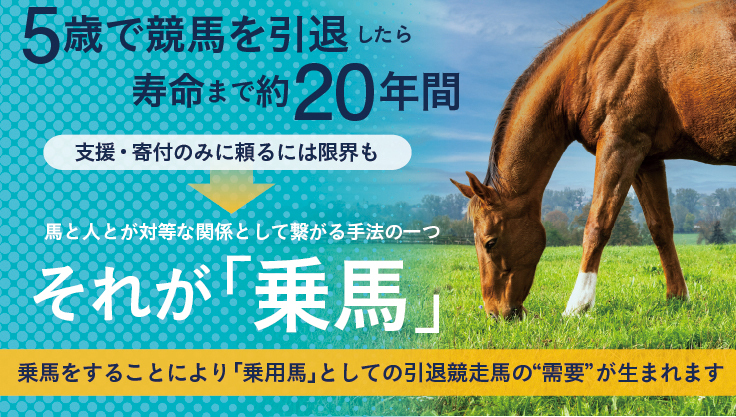 そのため、人と馬が協力し"共に稼ぐ"ということが必要不可欠になります。支援する人と支援される馬という一方通行的な関係ではなく、馬と人とが対等な関係として繋がる手法の一つ、それが「乗馬」だと私たちは考えています。乗馬人口の増加は乗馬クラブの新設や規模拡大(馬房数の増加)を促し、馬の居場所を増やすことにも繋がります。