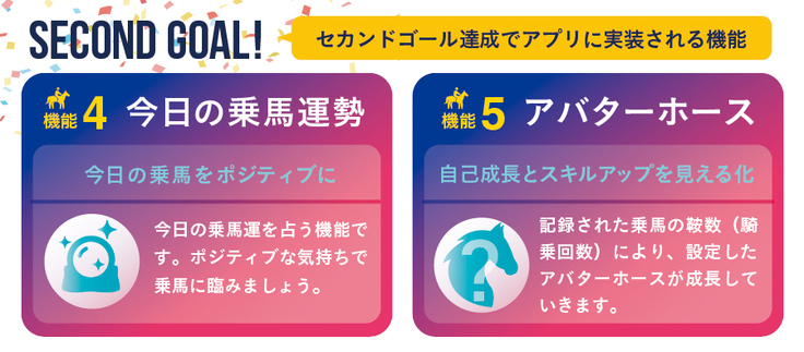 記録された乗馬の鞍数(騎乗回数)により、設定したアバターホースが成長していきます。アバターホースの成長により、今まで以上にポジティブな気持ちでこれからの乗馬を楽しんで頂けます。