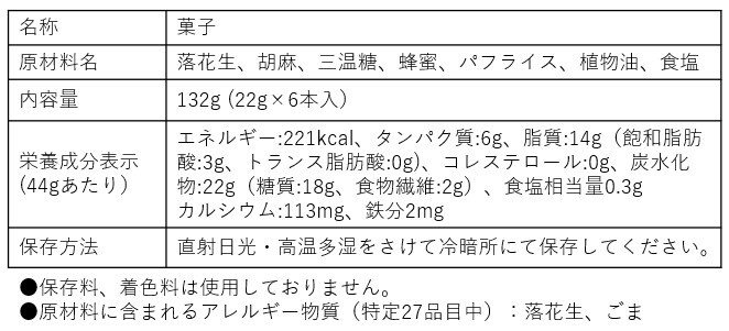 女性に人気の香ばしい炒りピーナッツと胡麻のナッツ・バー、パフライス入りの軽い食感です。ほんのり塩味をきかせて、さとうきび由来の三温糖と蜂蜜で味付けしています。