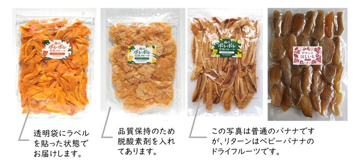 砂糖不使用ドライフルーツや干しいもを毎日のように食べたい、というご要望にお応えするために、透明袋に脱酸素剤を同封した「業務用」の仕様でお届けします。
