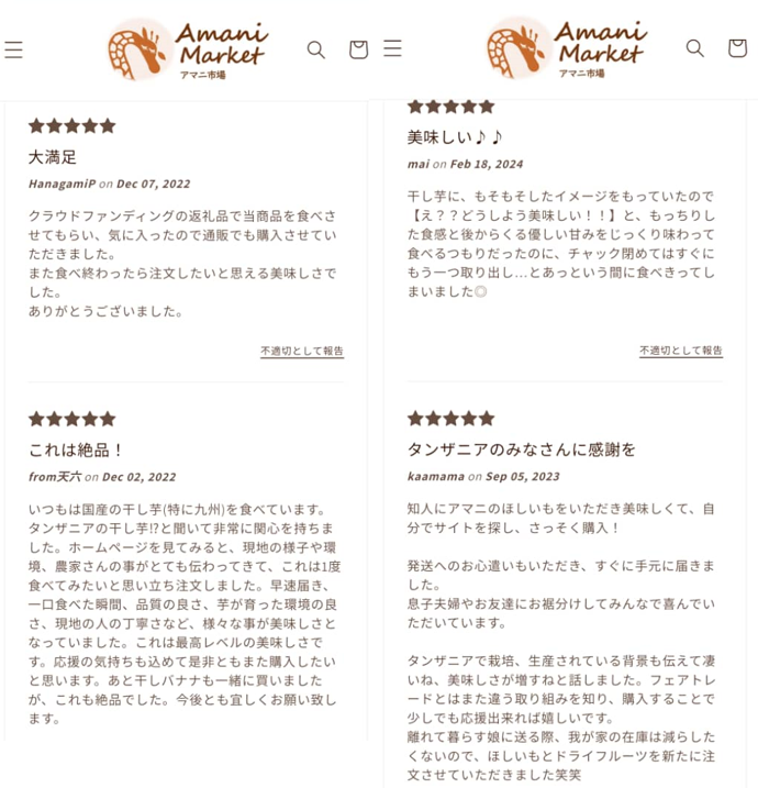 オンラインショップでは「甘すぎず上品な味」「ほっくりして、お芋の一番おいしい食べ方」など、嬉しいレビューも頂きました!契約農家とスタッフ一同、自分達の商品が海を越えて日本で評価されていることを誇りに思っています。
