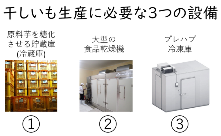 この時は、干しいもの生産に必要な3つの設備、すなわち①原料芋の貯蔵庫(冷蔵庫)、②大型の食品乾燥機、③商品を冷凍しておくプレハブ冷凍庫を導入して、工場から一度に3トンの干しいもを冷凍コンテナで輸出できる体制を整えたいと考えていました。