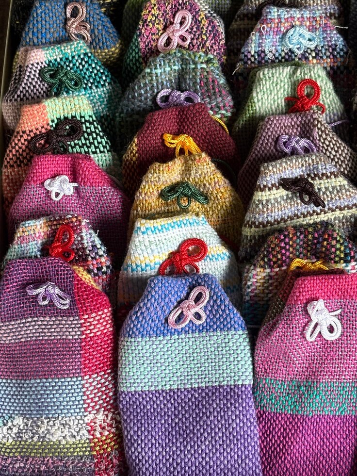 近所の支援施設で作ってくれた、世界に一つだけのさおり織りの御守り袋。
